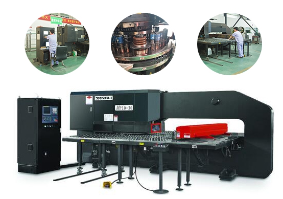 MP10系列數(shù)控轉(zhuǎn)塔沖床采用閉式機身(ZL 2004 2 0108852.4),整機經(jīng)壁爐回火處理,整套進口德國哈雷公司(H+L)液壓系統(tǒng),穩(wěn)定可靠,能耗低(僅11kW);數(shù)控系統(tǒng)采用SIEMENS 802DSL;長鑲套式結(jié)構(gòu)轉(zhuǎn)盤(ZL 02 2 18211.X),旋轉(zhuǎn)工位采用剖分式蝸輪蝸桿機構(gòu):國際化配套的氣動元件及電氣元件,進口大導程滾珠絲桿、直線導軌,鋼球、毛刷結(jié)構(gòu)工作臺,配備高性能全自動浮動式夾鉗。
